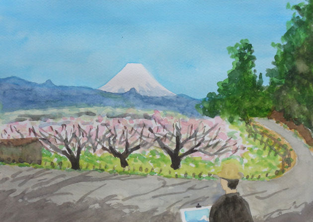 離れて丘陵裾の道を歩いていたら…道端で水彩画を描いてい人が。